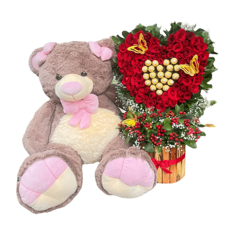 Corazón de Rosas & Ternura – Arreglo con Peluche de 100 cm